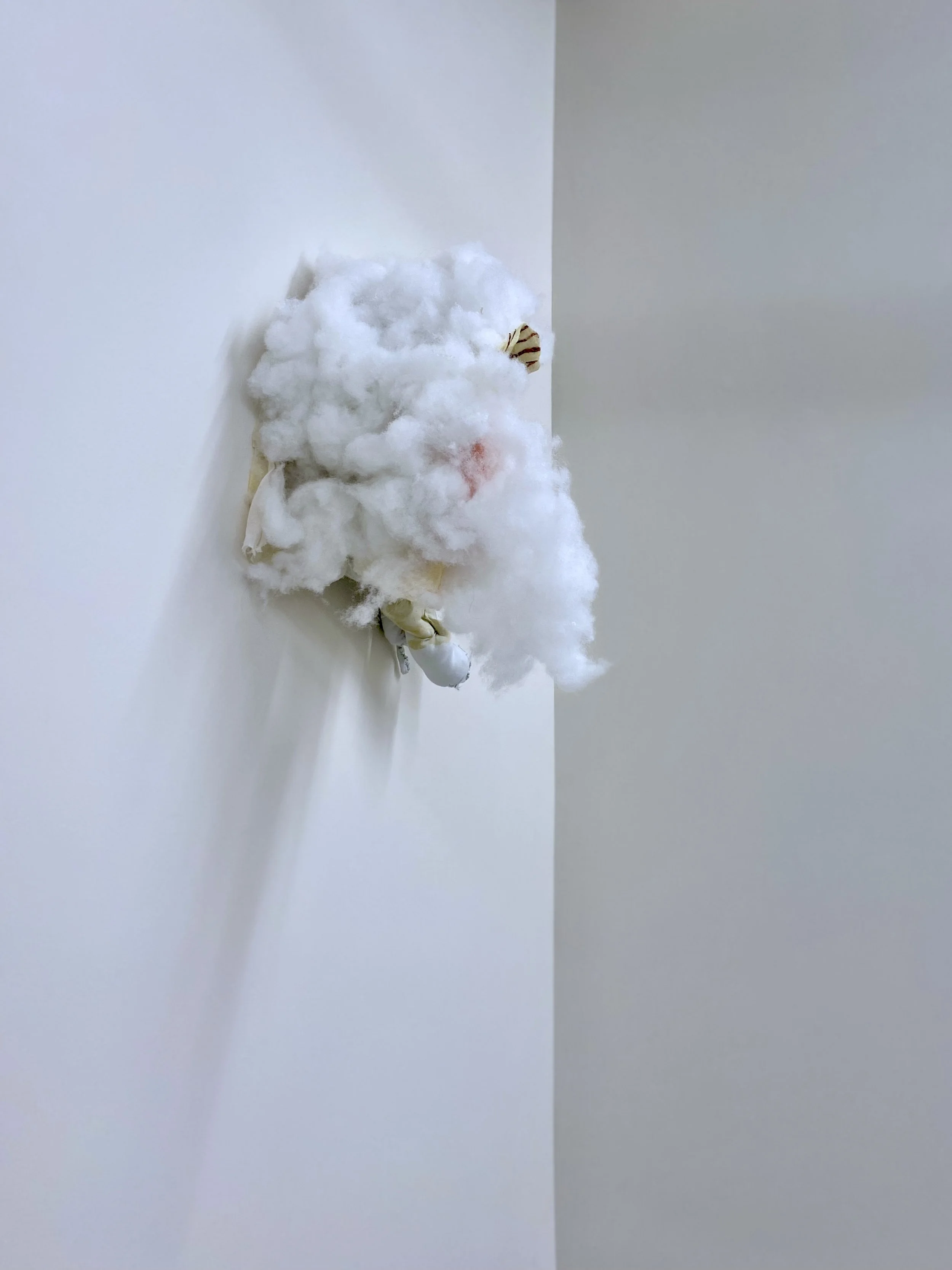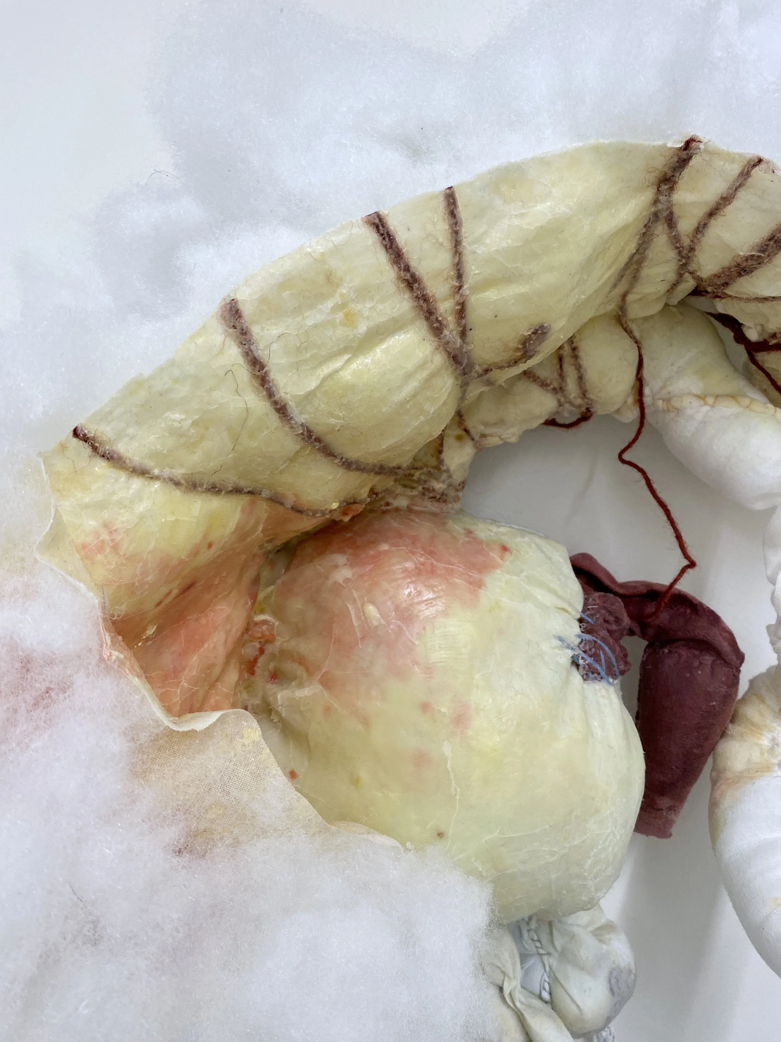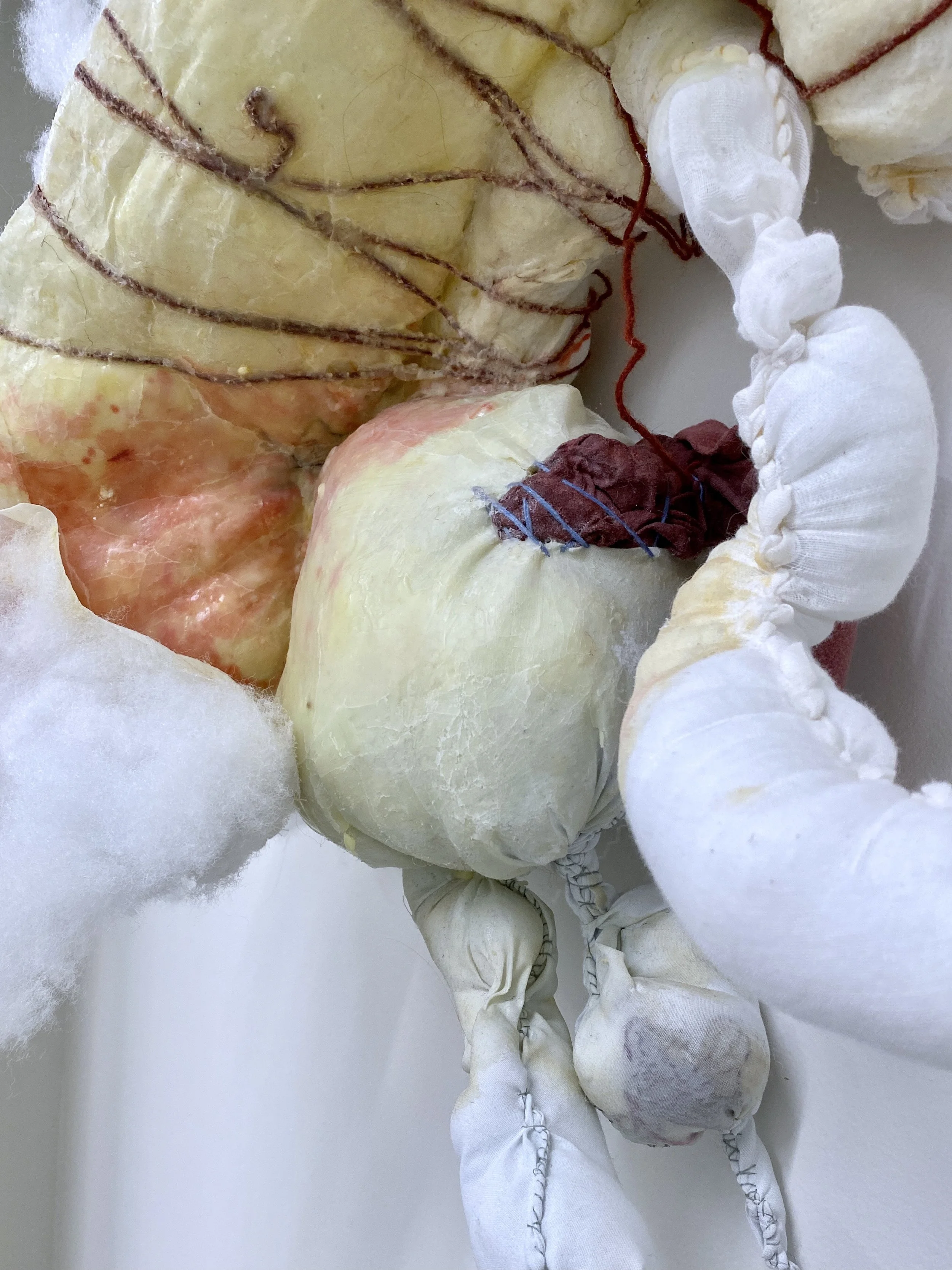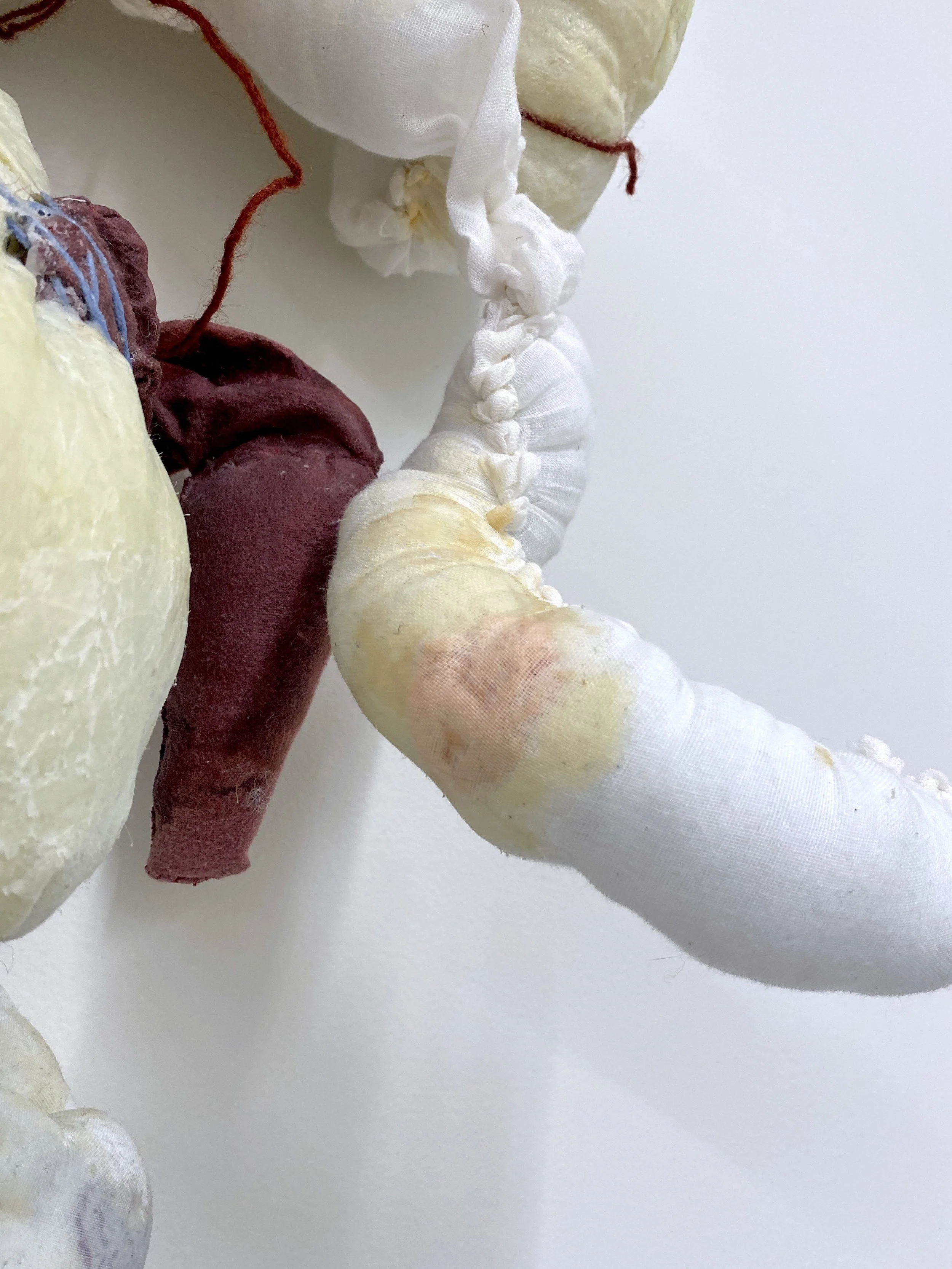 remnants of various unwashed bedsheets, polyfil, cosmetic grade beeswax, my great aunt’s string, thread, cheesecloth, liquid latex, felt, acrylic paint, gouache, acrylic gloss medium, nail