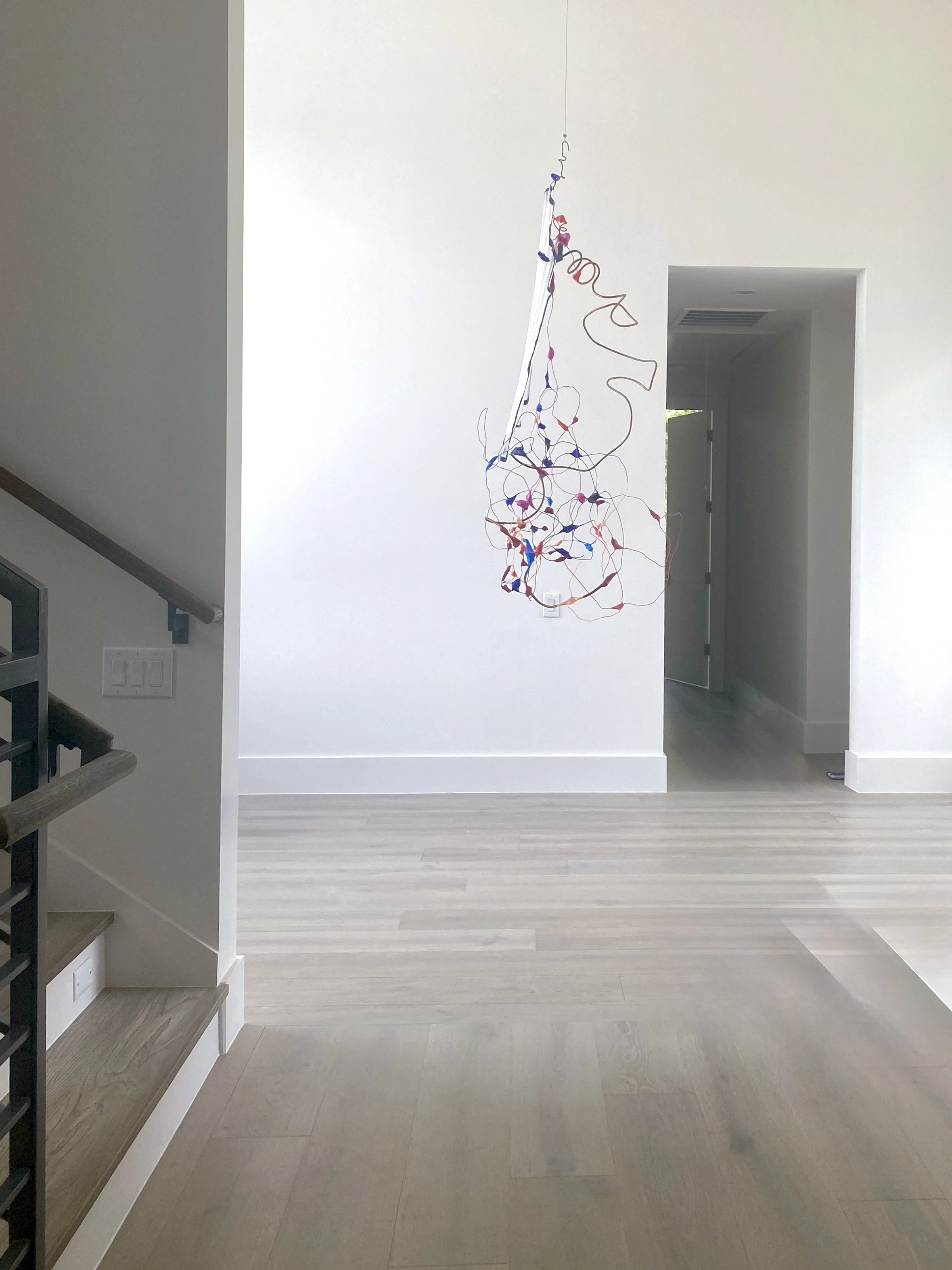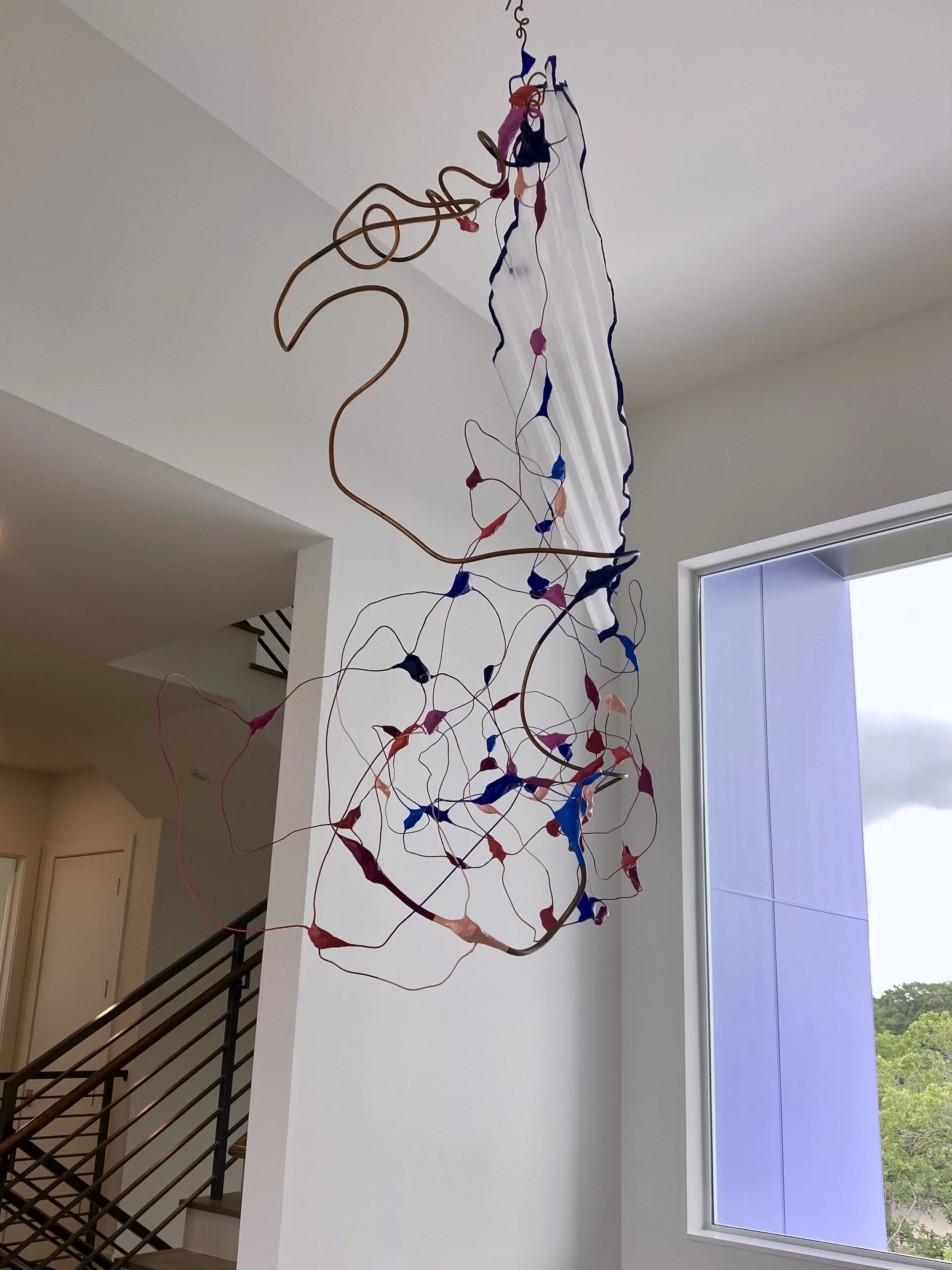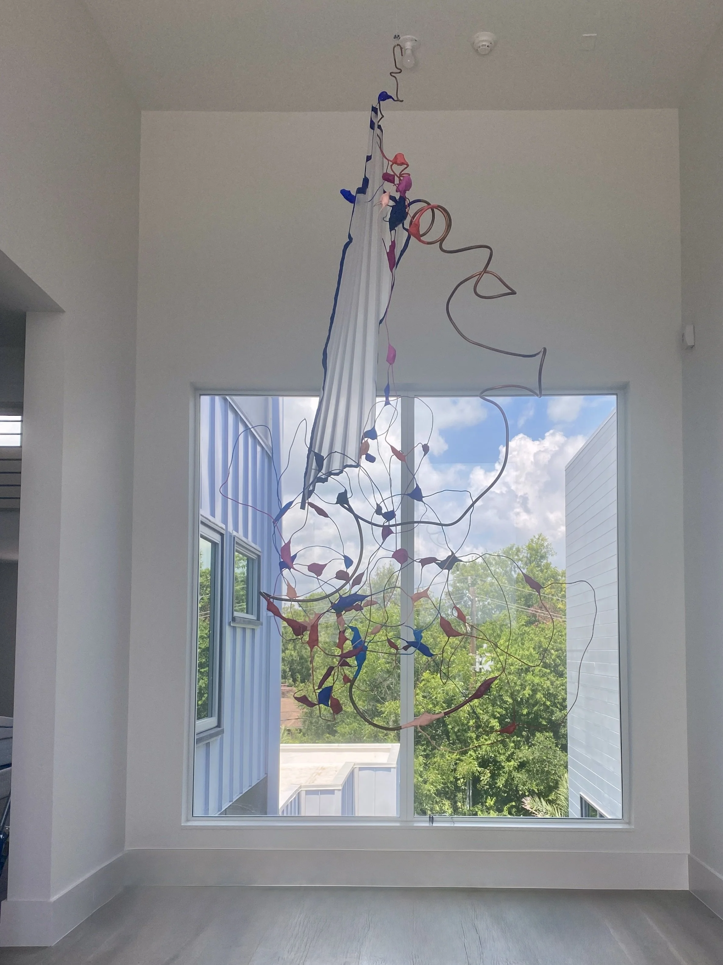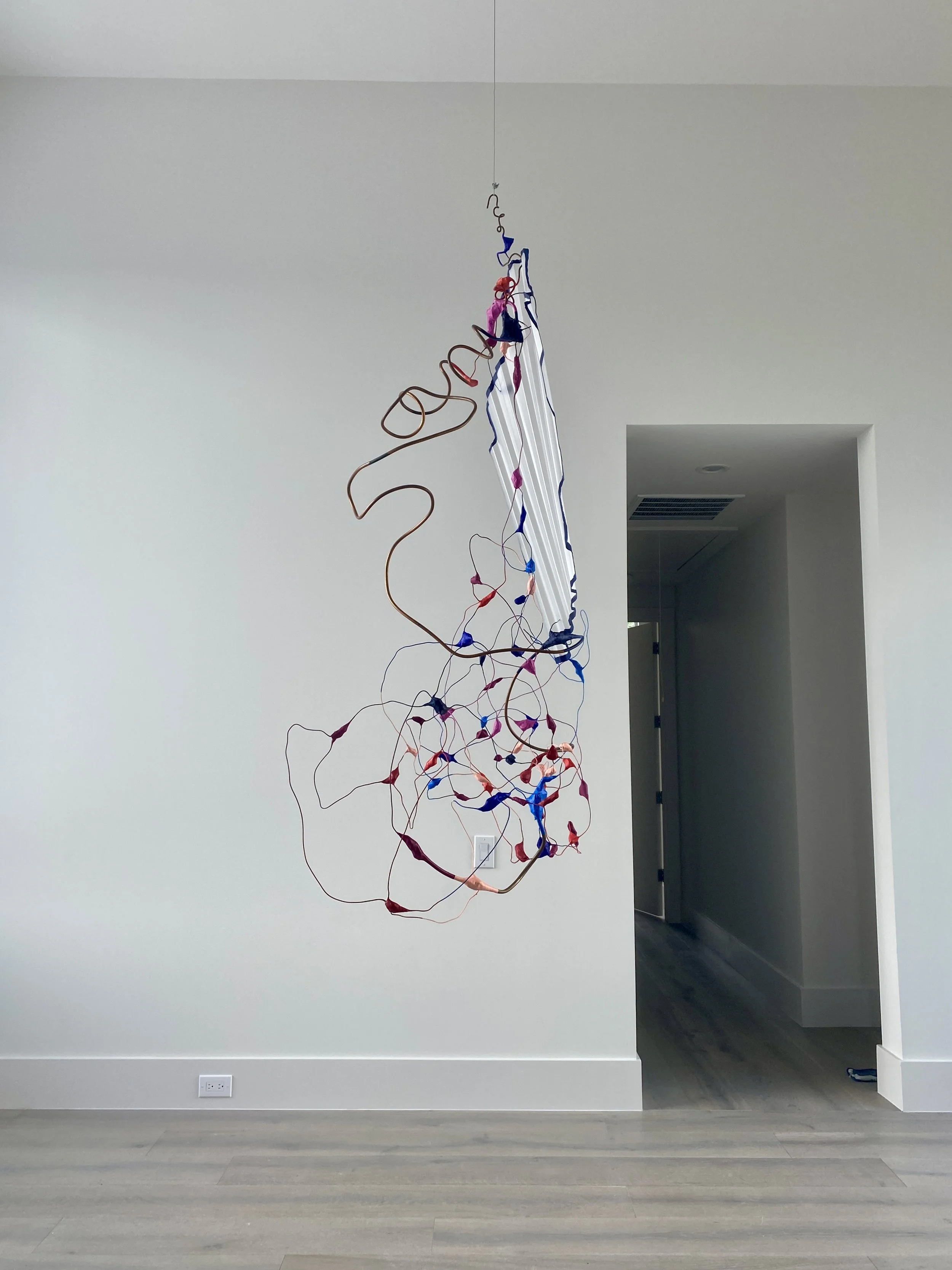 gouache, acrylic, latex paint, joint compound, yarn, found corrugated plastic, steel hardware, newspaper, glue, painter’s tape, steel wire, found copper tubing