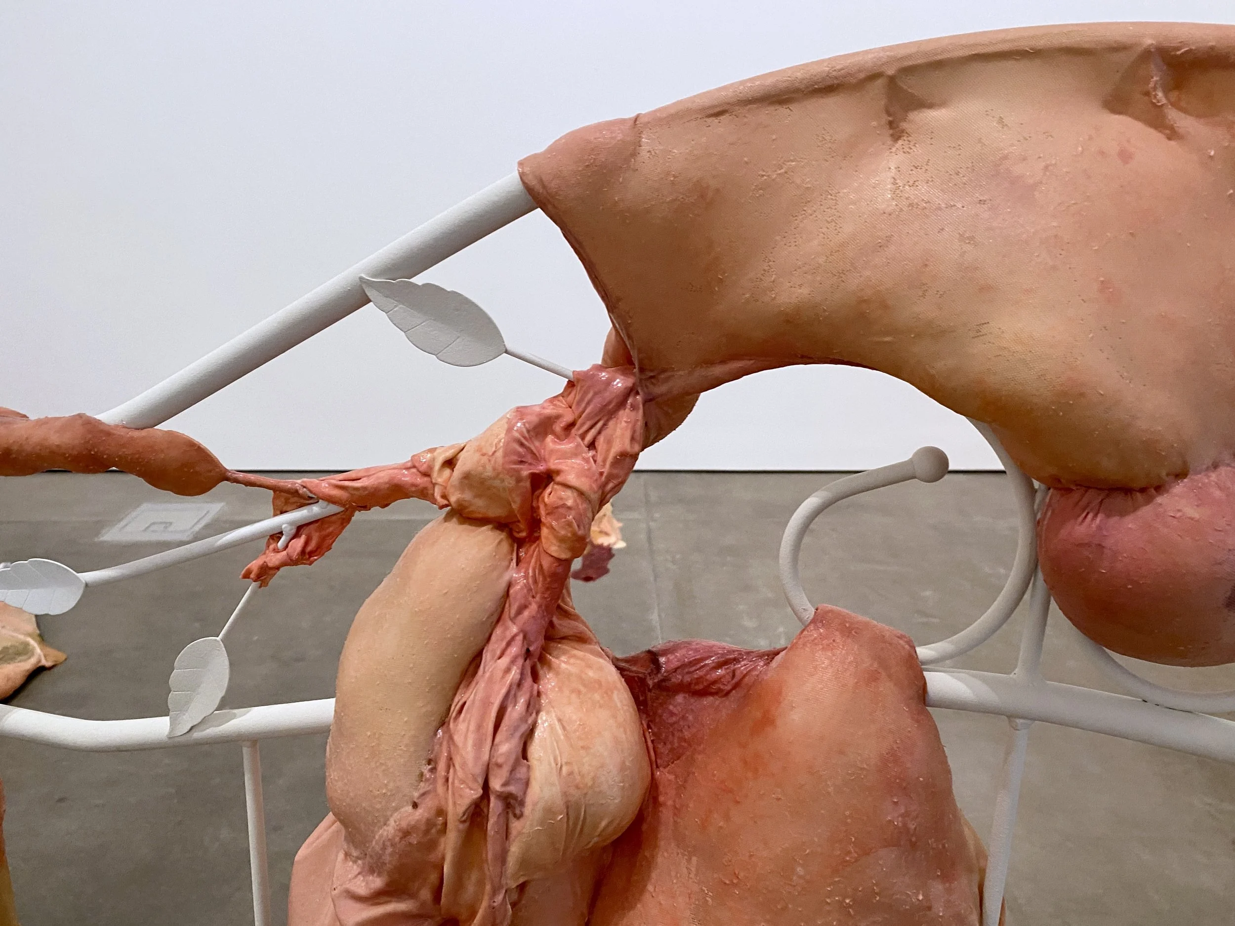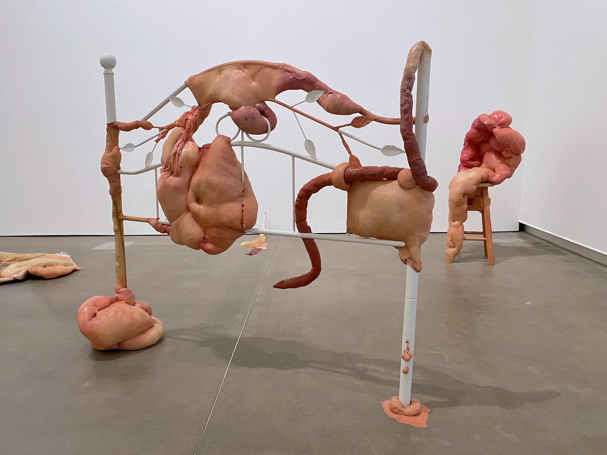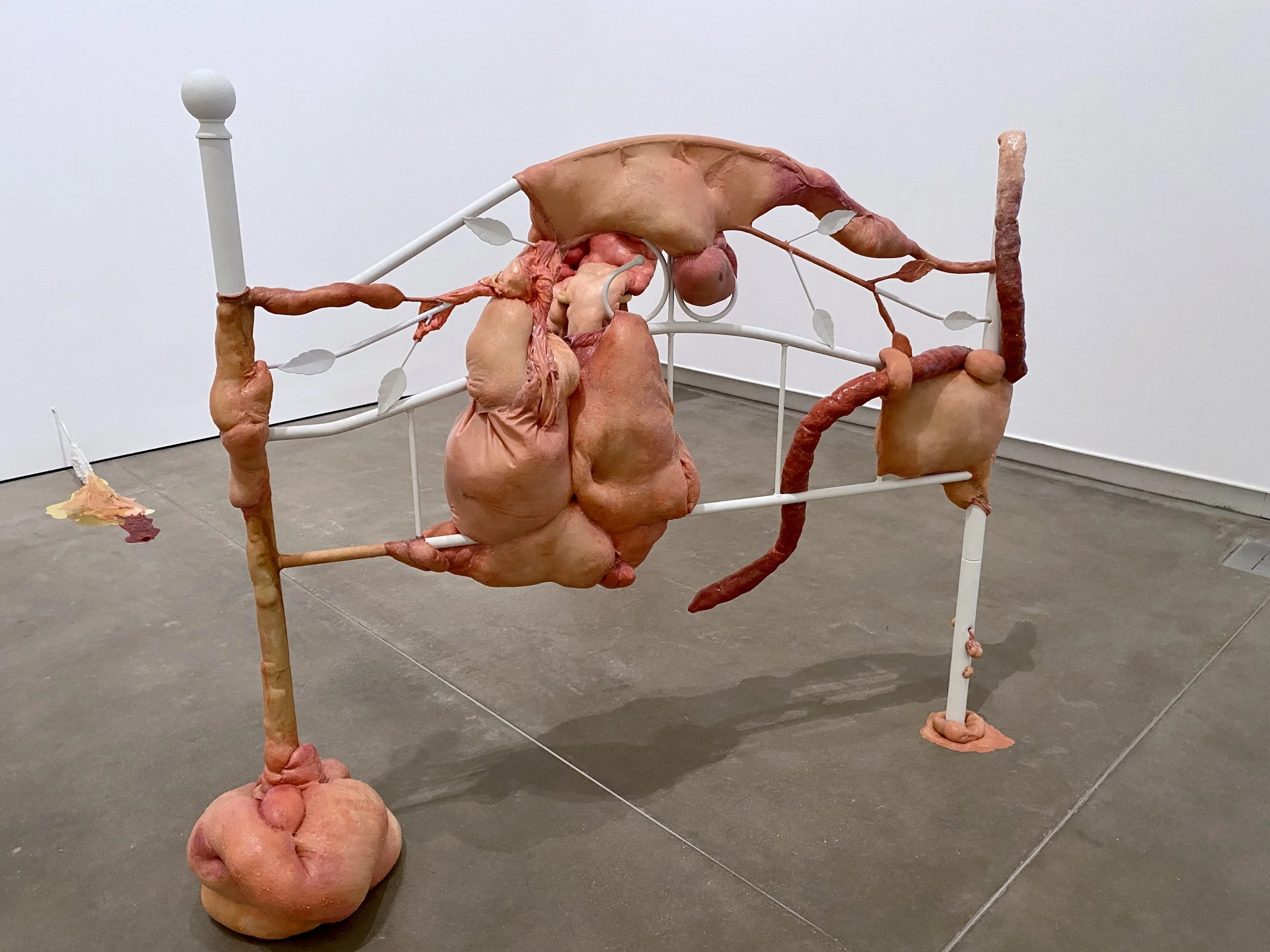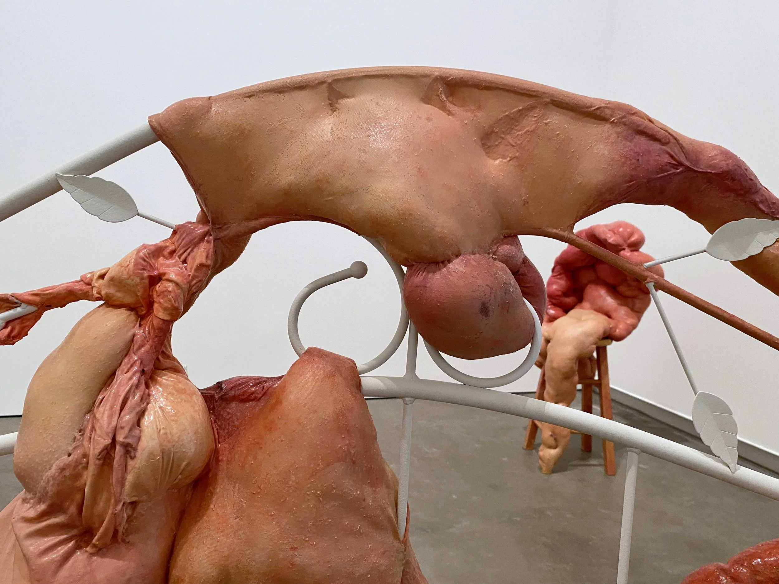 liquid latex, spandex nylon, used headboard, Polyfil, used dryer sheets, gouache, acrylic paint, galvanized steel wire, acrylic gloss medium, wool felt, used bedhseets, fraternity shirt remnants, my great grand mother’s string
