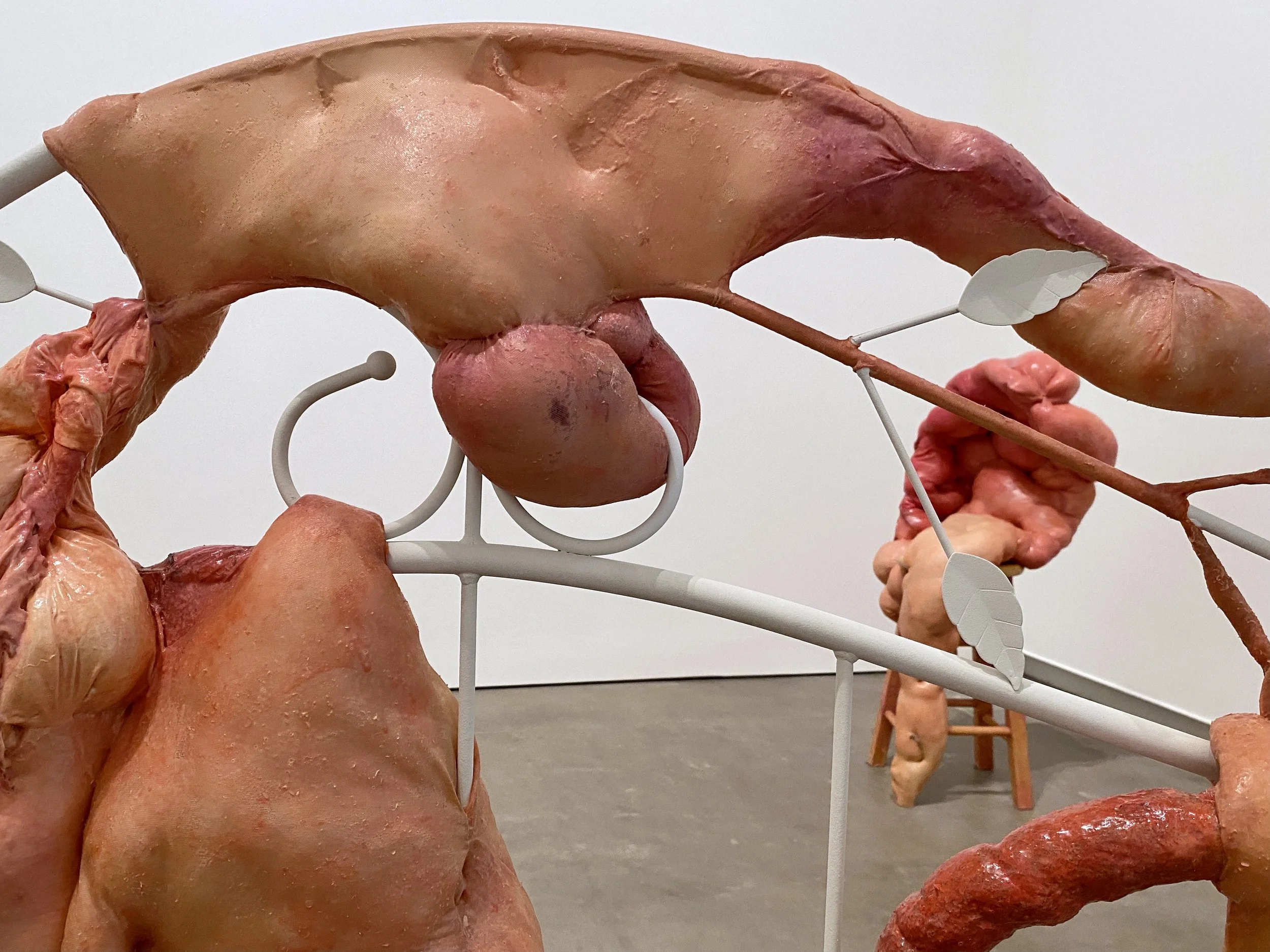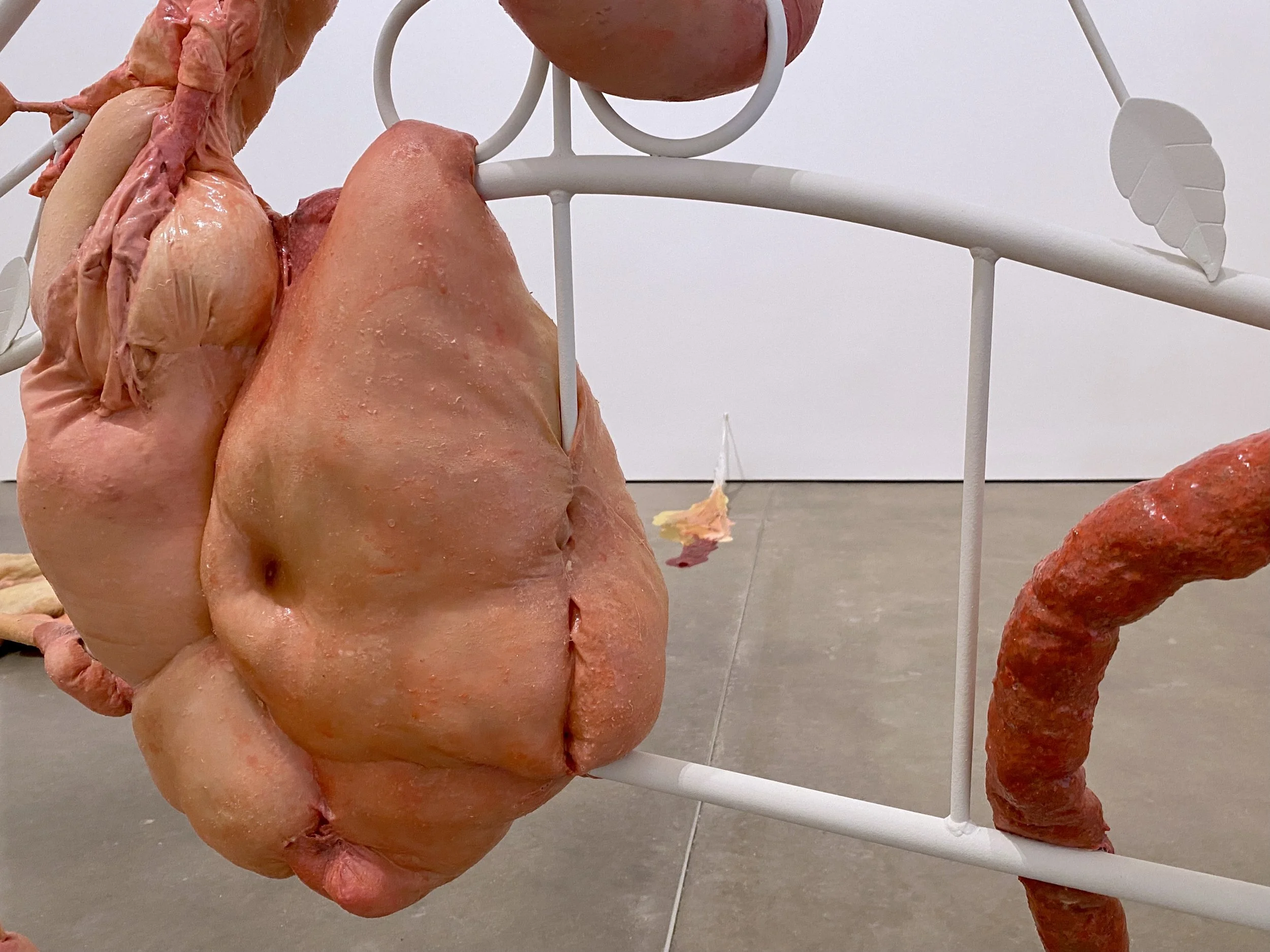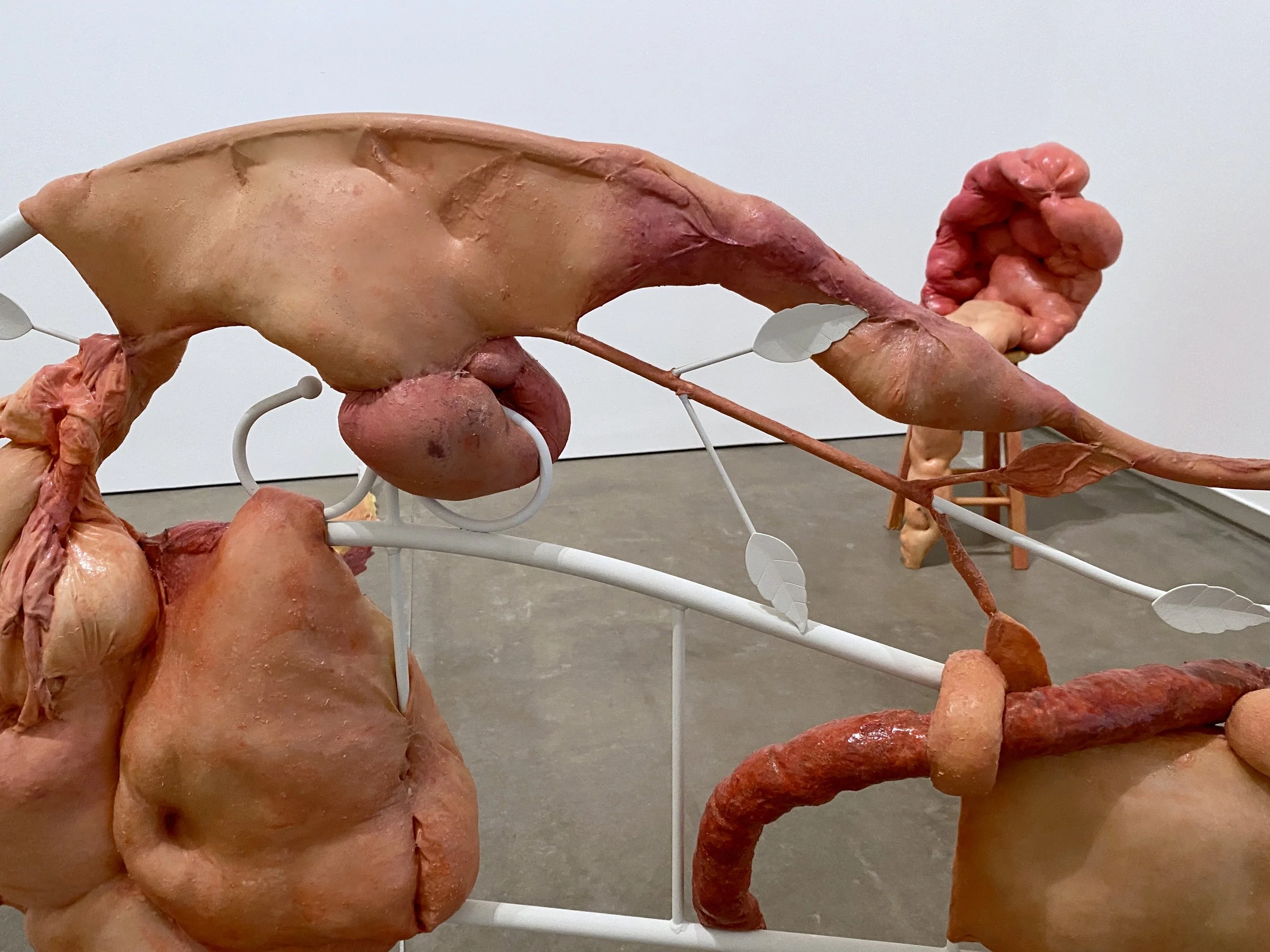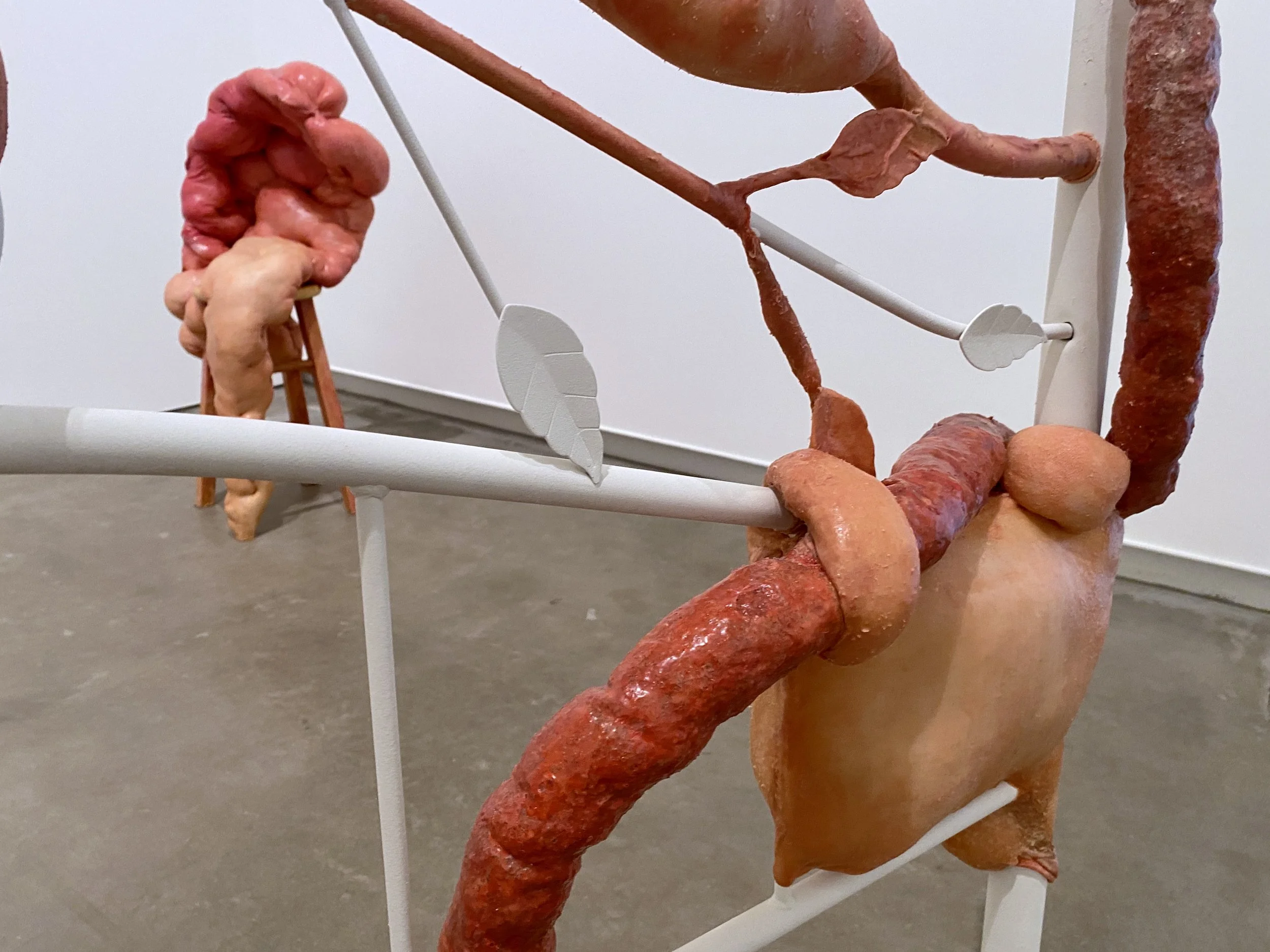 liquid latex, spandex nylon, used headboard, Polyfil, used dryer sheets, gouache, acrylic paint, galvanized steel wire, acrylic gloss medium, wool felt, used bedhseets, fraternity shirt remnants, my great grand mother’s string