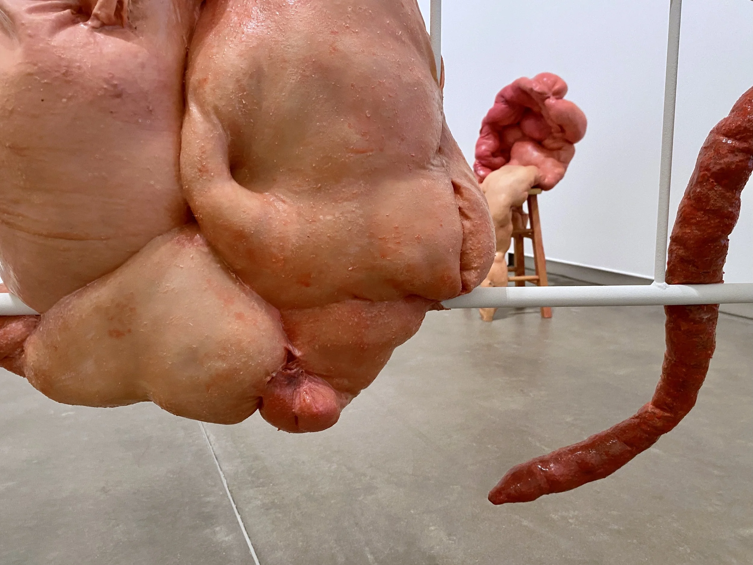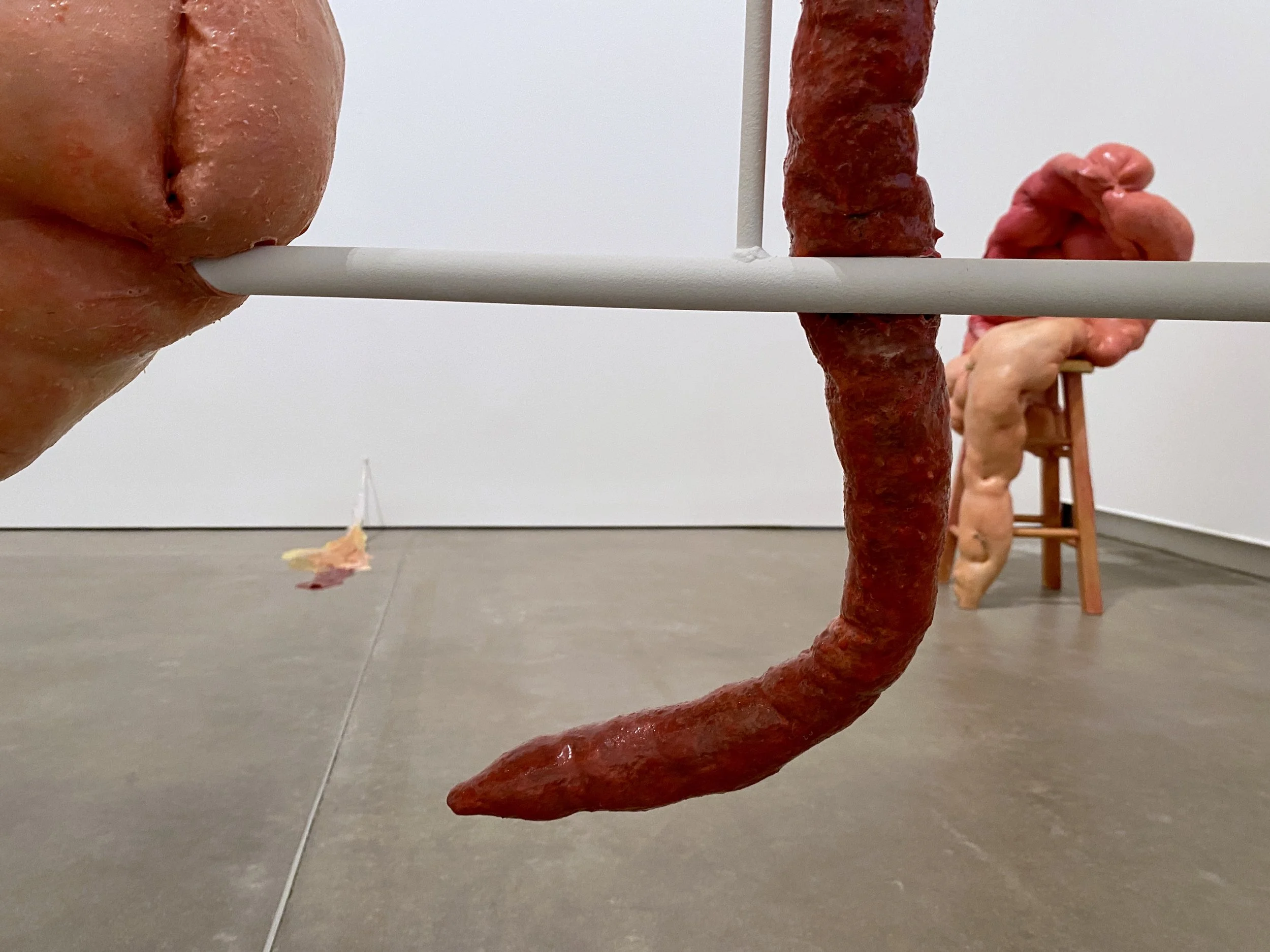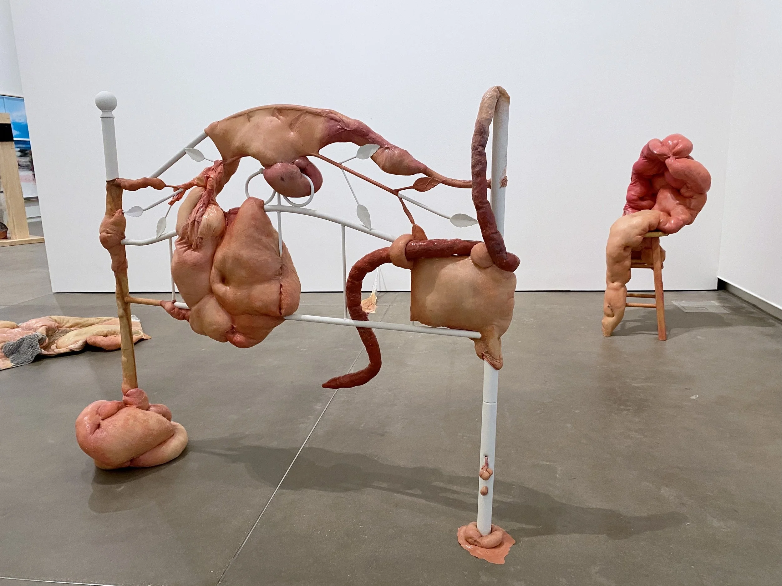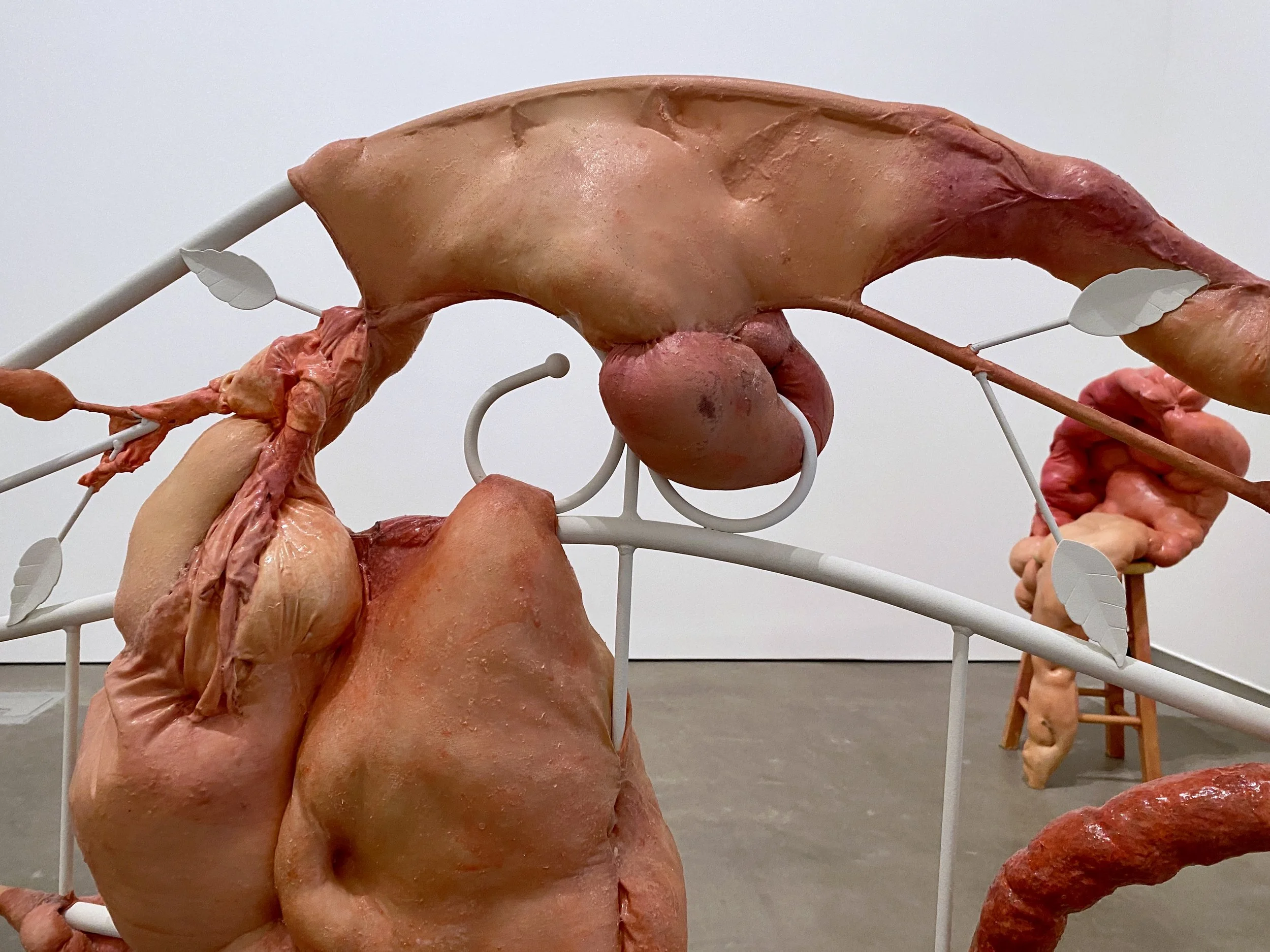 liquid latex, spandex nylon, used headboard, Polyfil, used dryer sheets, gouache, acrylic paint, galvanized steel wire, acrylic gloss medium, wool felt, used bedhseets, fraternity shirt remnants, my great grand mother’s string