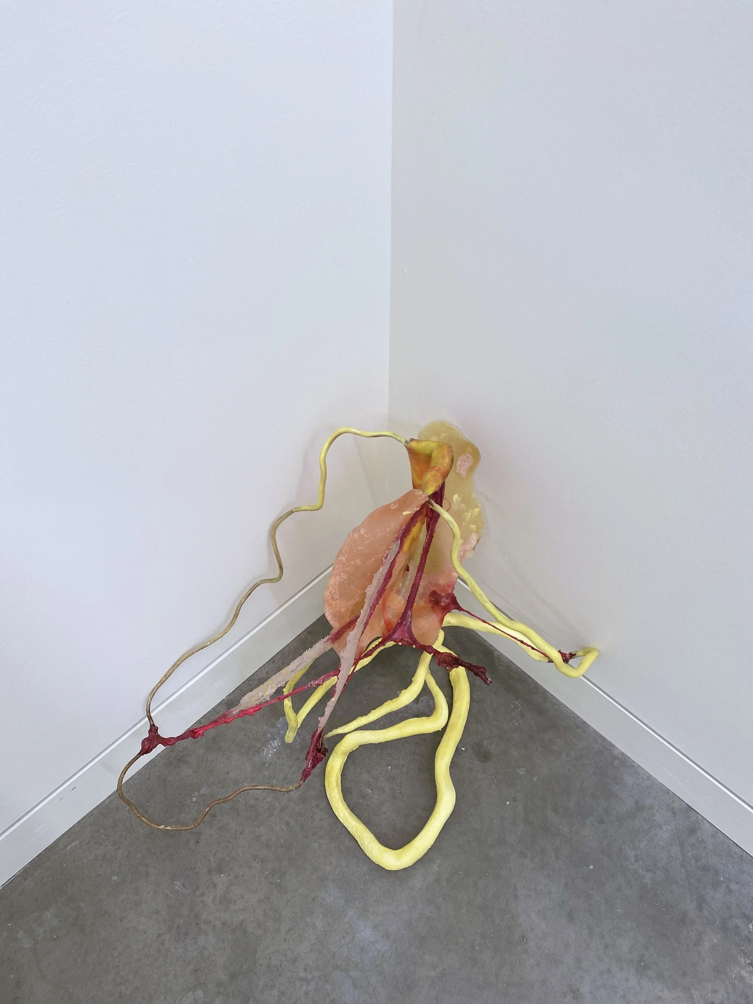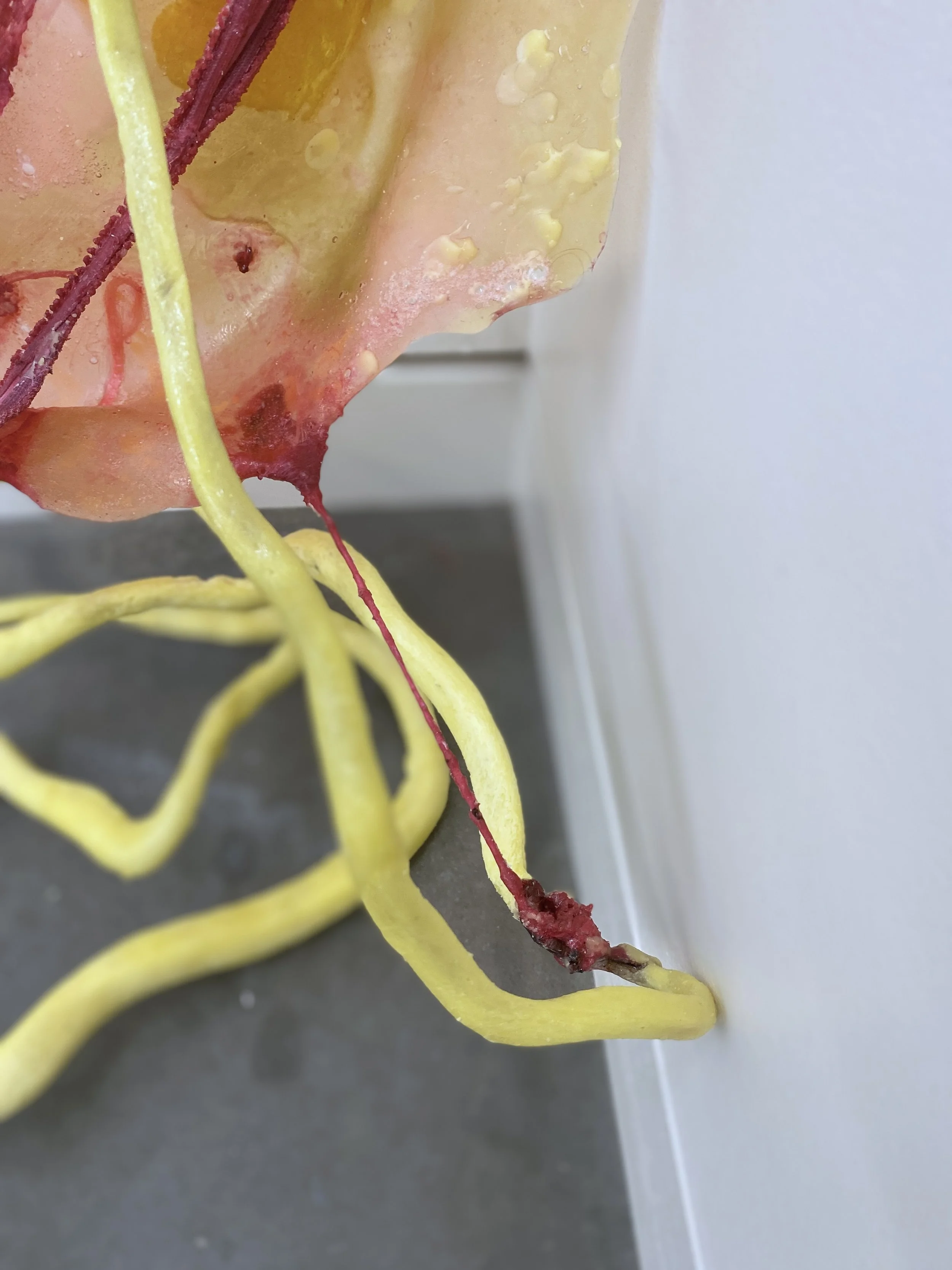 liquid latex, my used lace thong, medical gauze, cosmetic grade beeswax, acrylic gloss medium, gouache, acrylic paint, copper wire