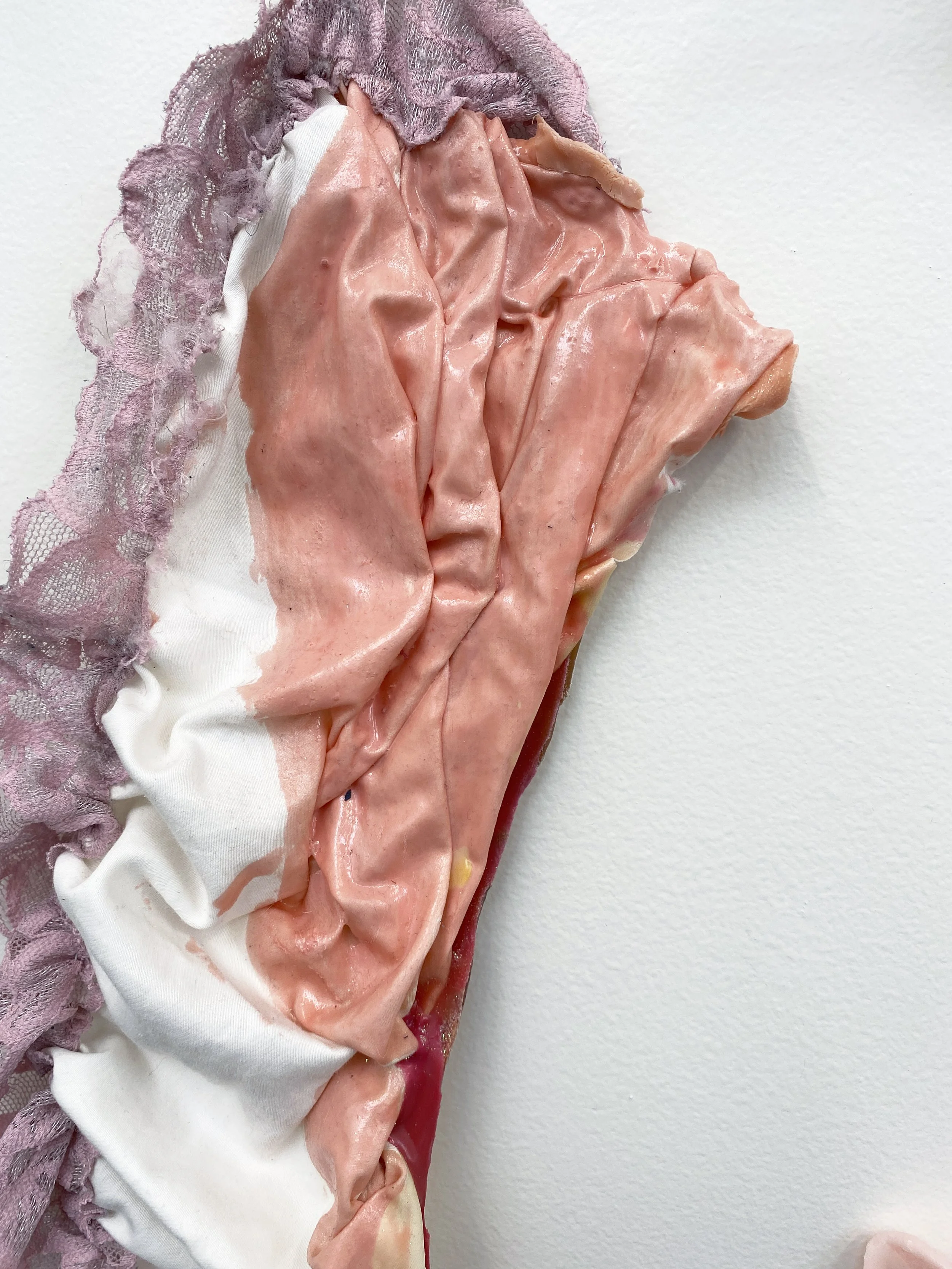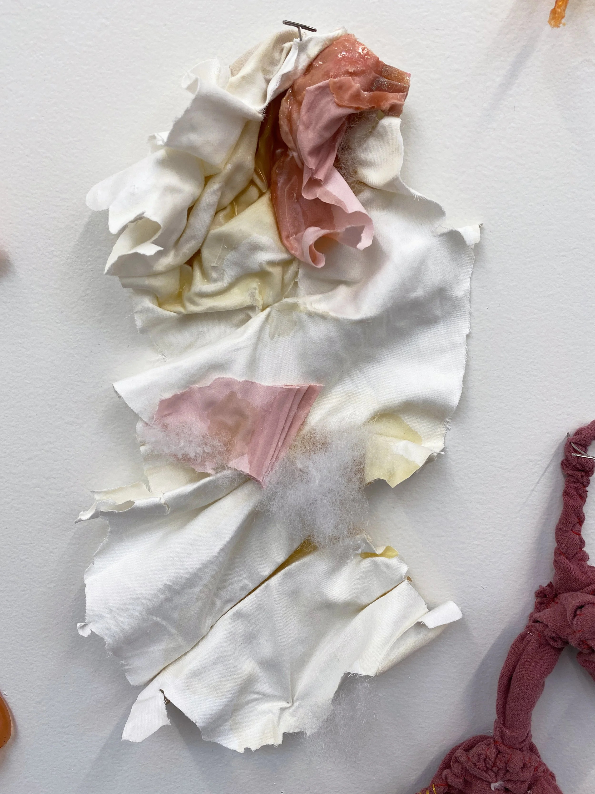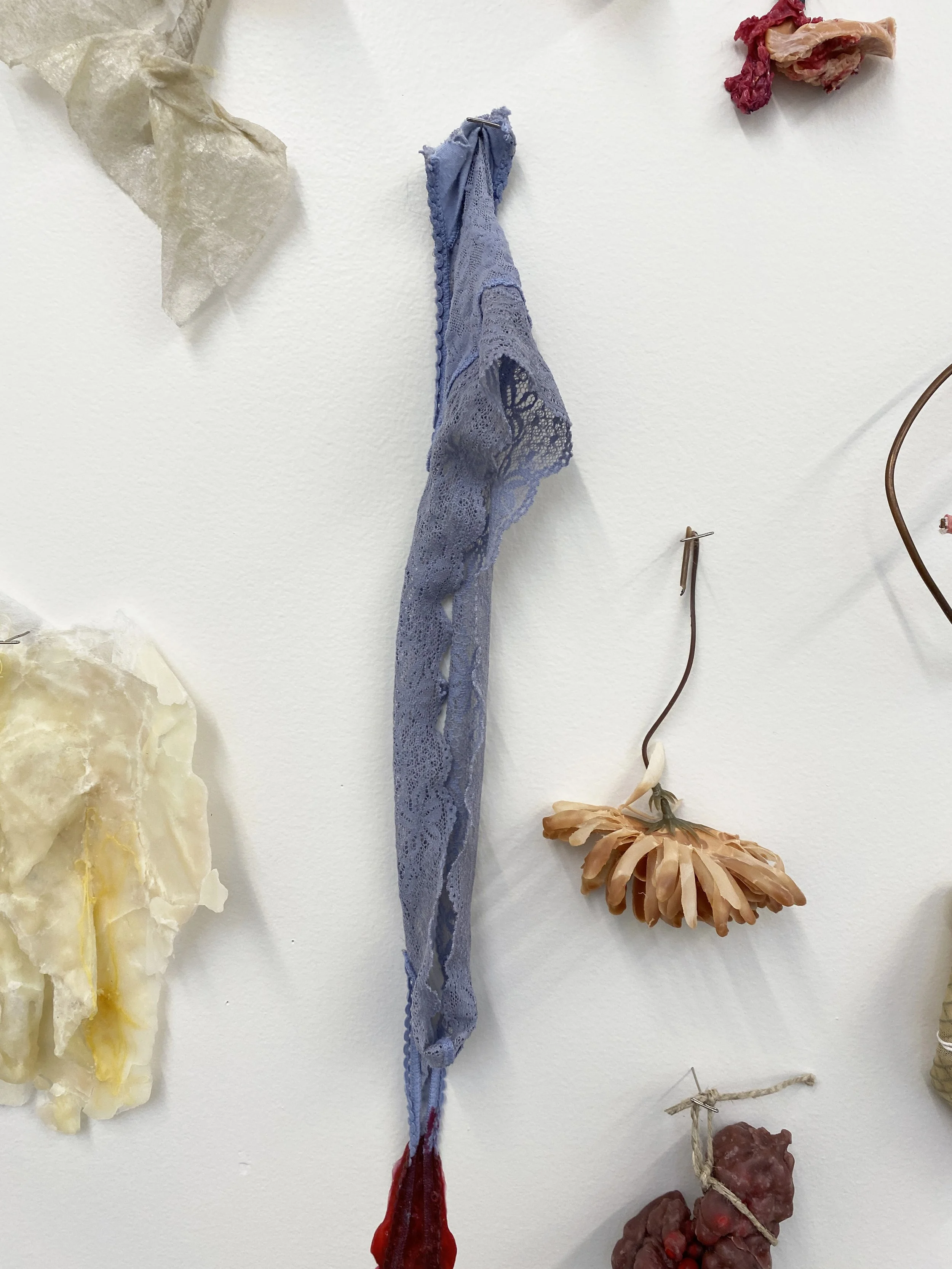 liquid latex, my worn underwear, acrylic paint, gouache, acrylic gloss medium, flannel bedsheets, paint brush bristles, twine, yarn, used dryer sheets, chicken wire, faux flowers, nylon, organza, military grade spill clean-up pouches, copper wire, T-pins