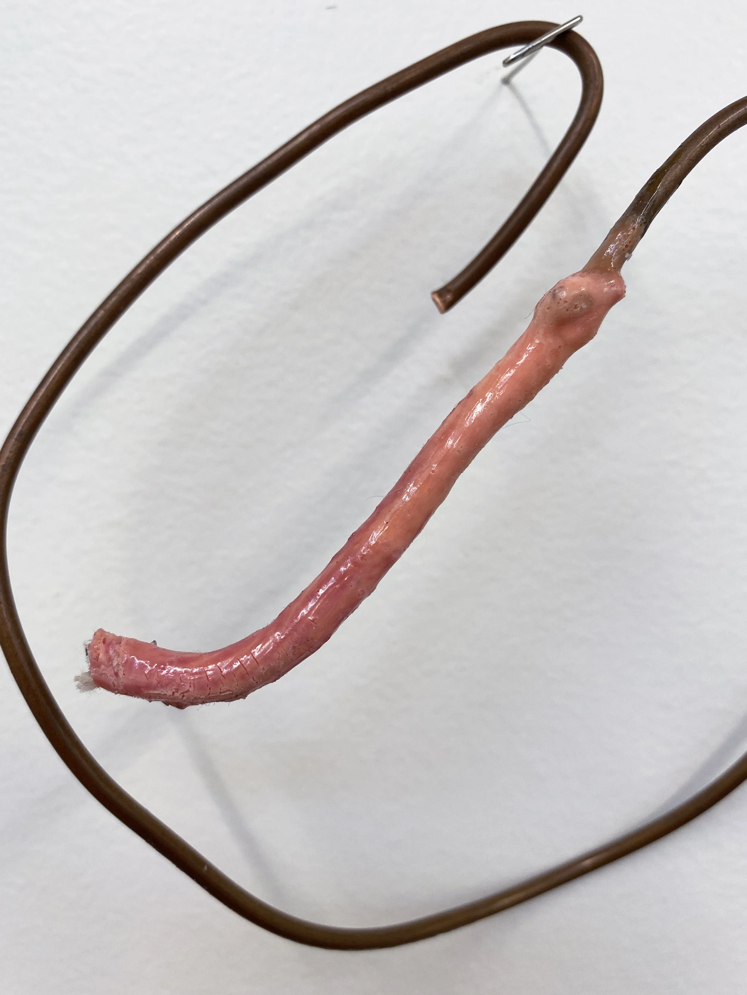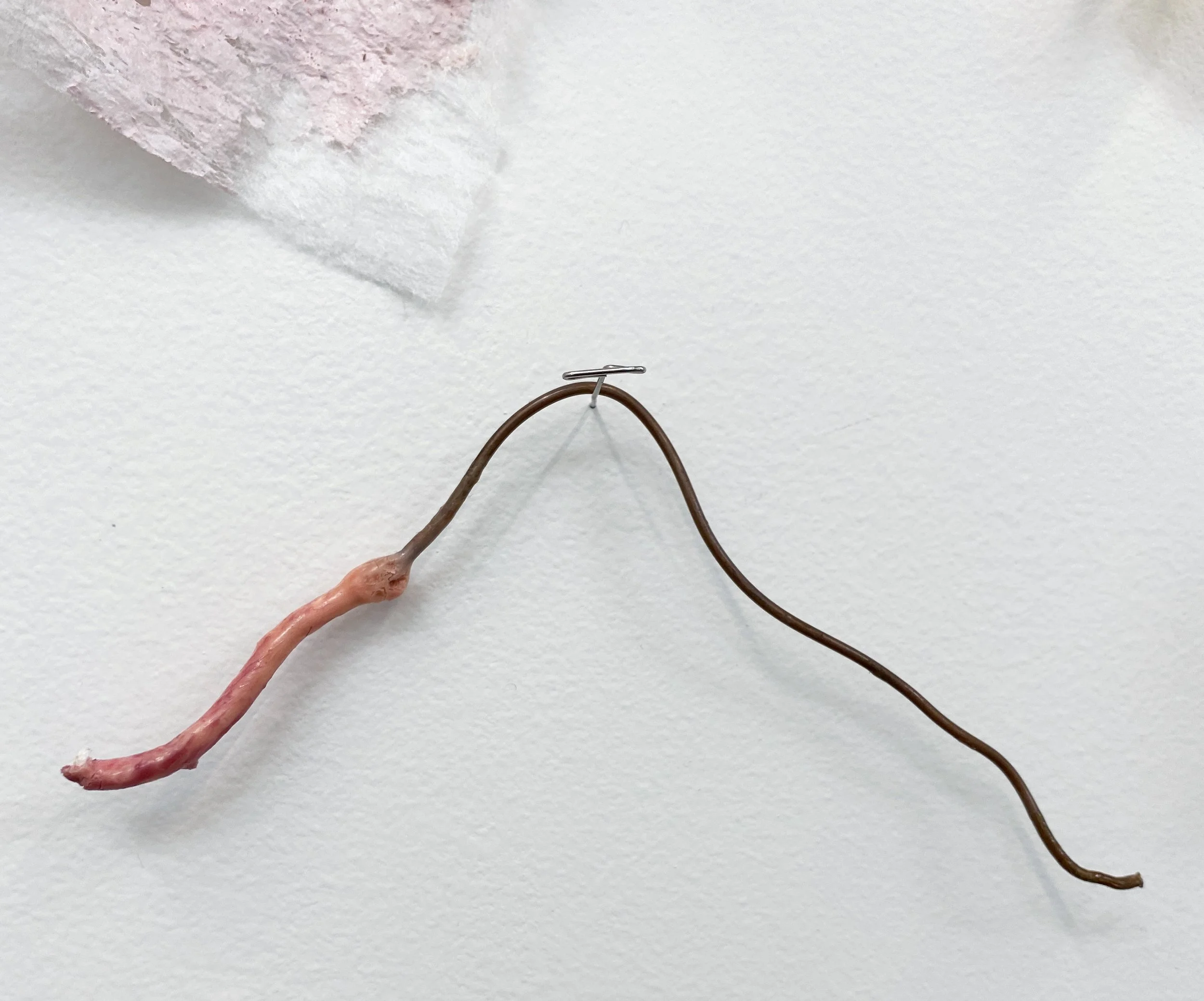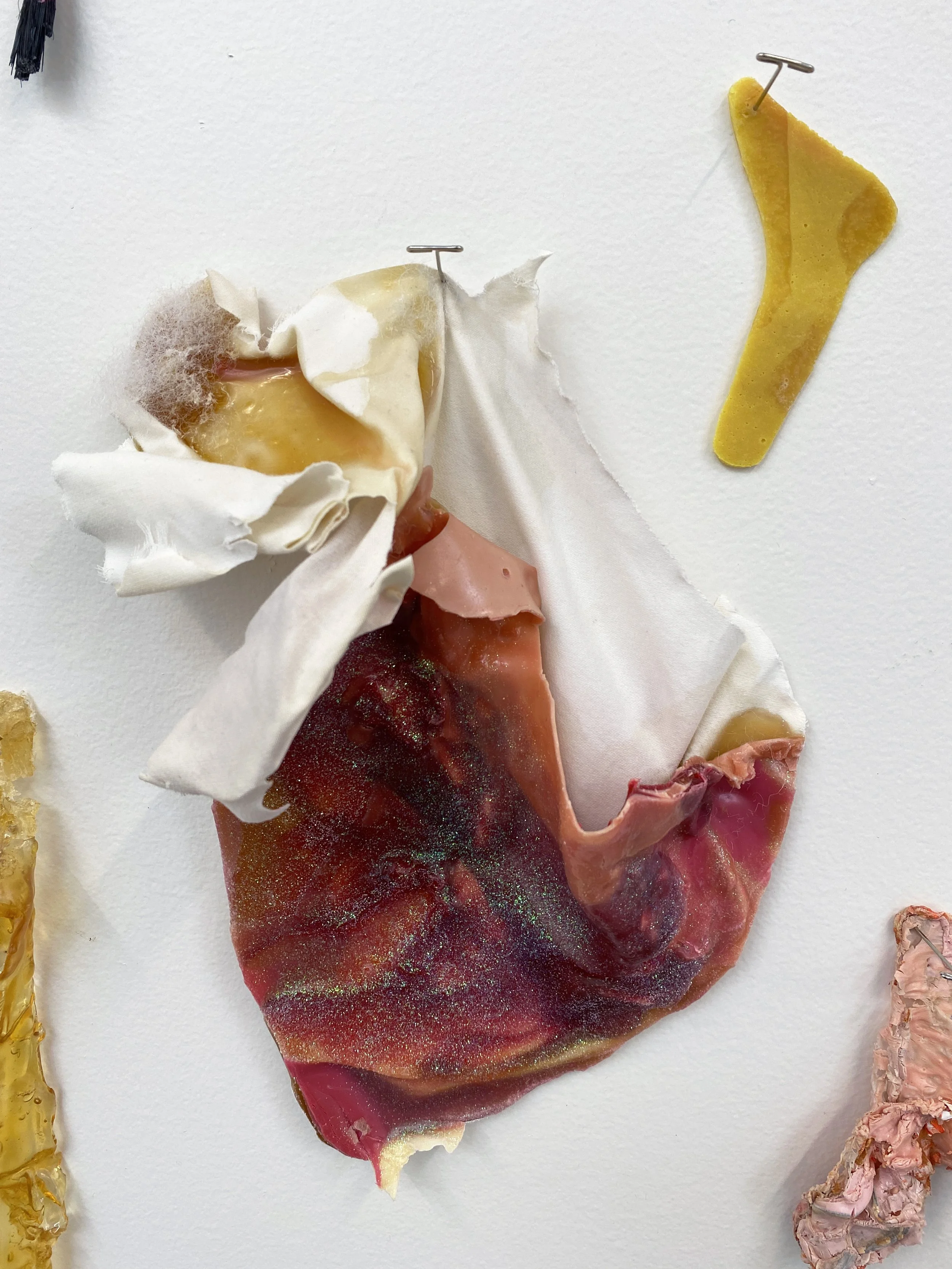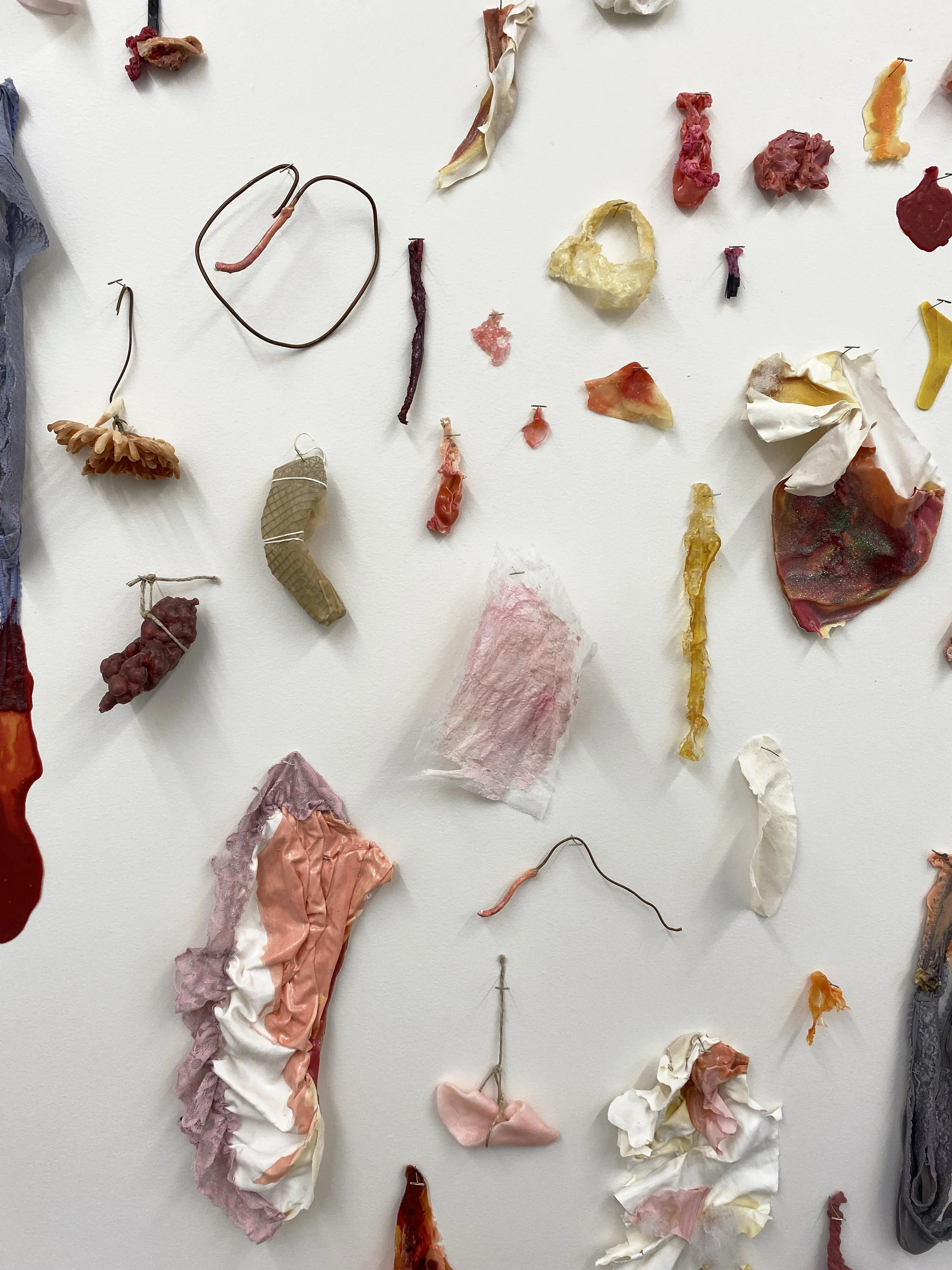 liquid latex, my worn underwear, acrylic paint, gouache, acrylic gloss medium, flannel bedsheets, paint brush bristles, twine, yarn, used dryer sheets, chicken wire, faux flowers, nylon, organza, military grade spill clean-up pouches, copper wire, T-pins