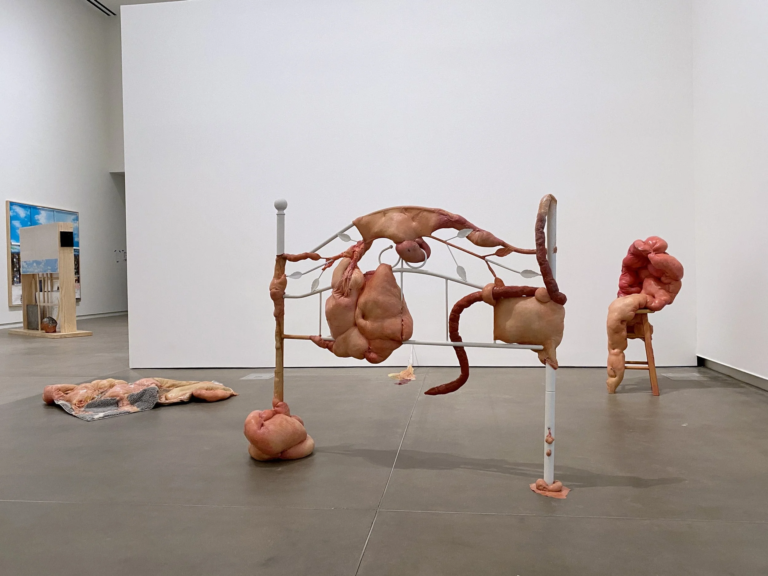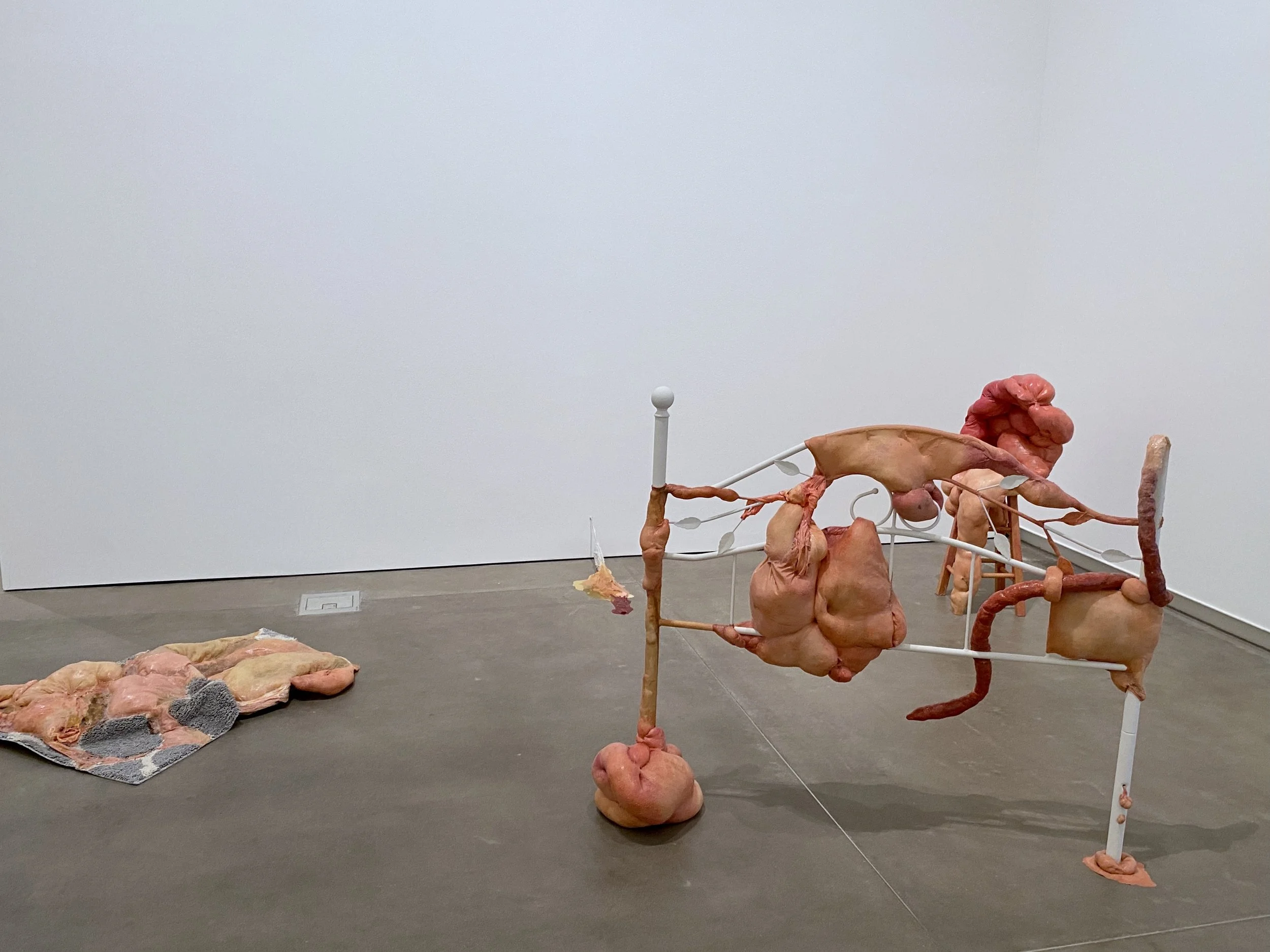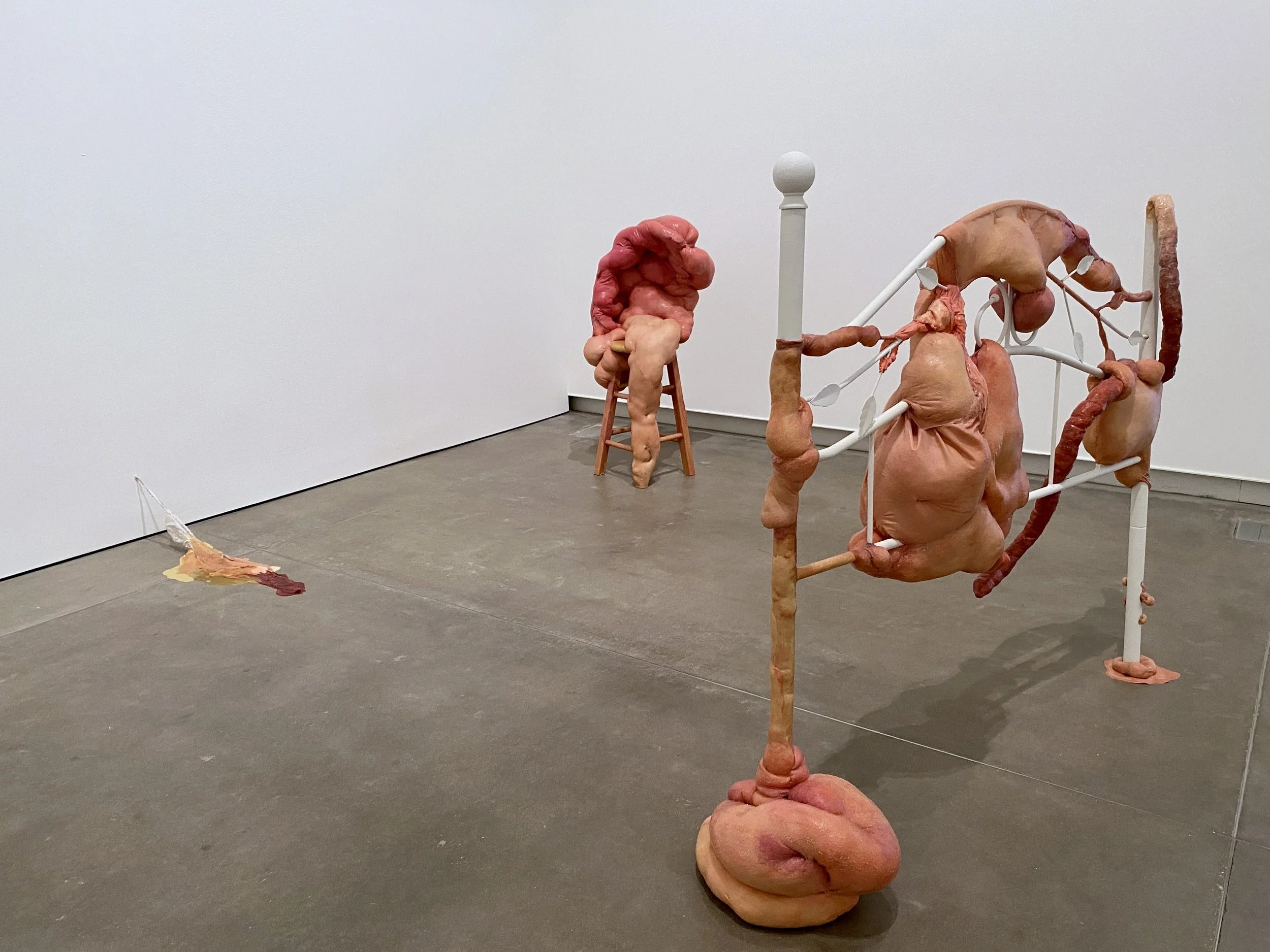 In the first part, the body in the bedroom landscape conveys how rape stains the violated spaces of the body and bedroom. To authentically embody the inescapable sensation of living with sexual trauma, my own furniture becomes overgrown by an invasive species of latex skin. This baby pink skin is irritated and infected, a recognizable depiction of the trauma. We do not see many accurate examples of survivors healing from rape. The representation of feminine bodies as objects throughout the canon of art history does not help the empowerment of living feminine bodies. In various stages of healing, my sculptures are uncomfortably intimate with themselves as they tenderly search for self-love. Once in public, they contort in pain as they directly acknowledge their state of fragmentation.
